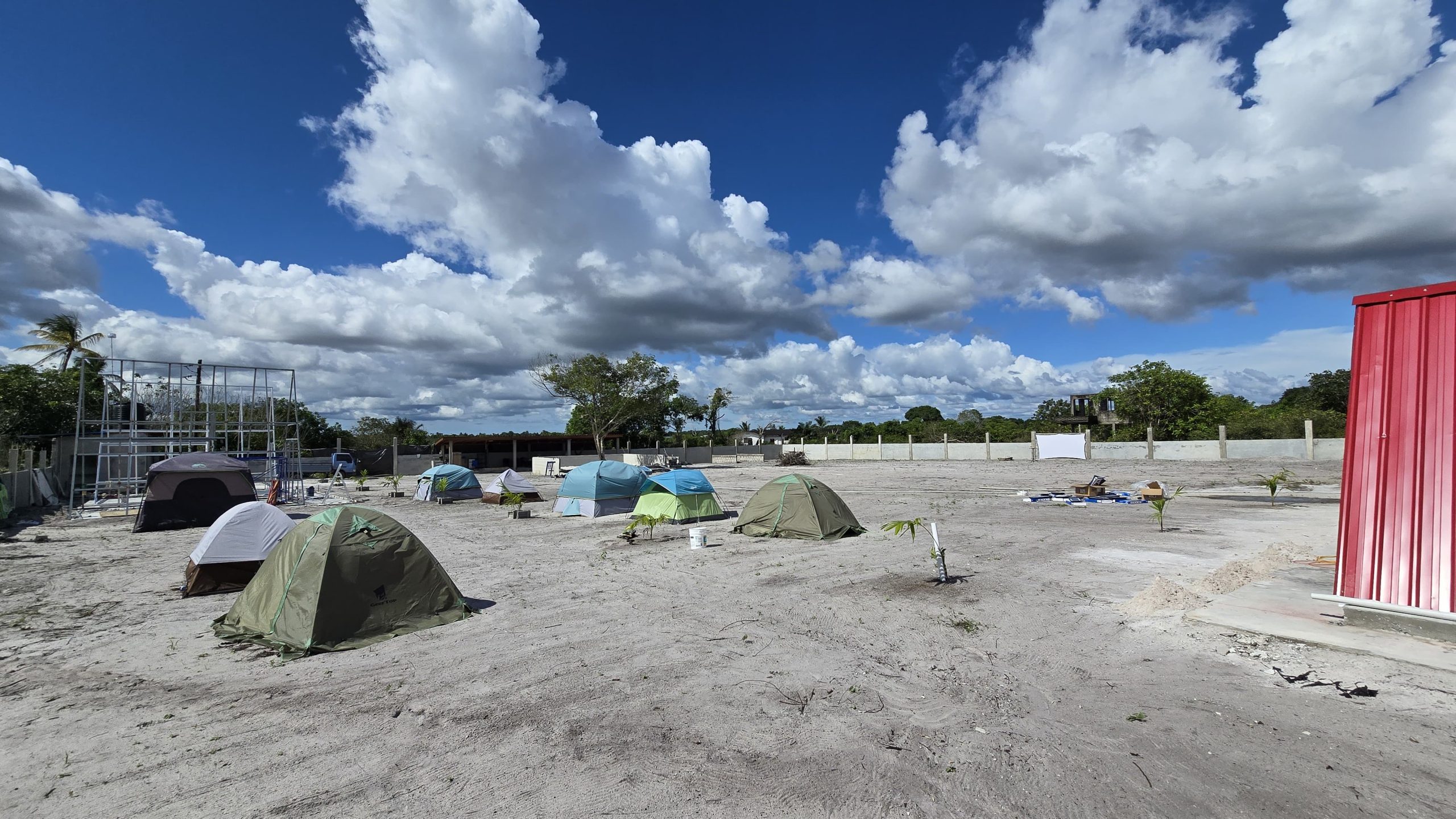 A 50-foot shed serves as a dwelling area, equipped with a pool table, outdoor seating (sofa, hammocks & Chairs), a BBQ grill, fireside , refrigerator, shelving, counter space, sink, solar lighting, and electrical outlets for charging devices. Two large music systems are available for entertainment.